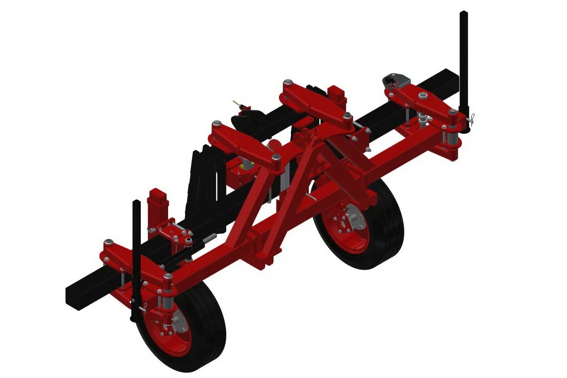 So könnte dein IC-Weeder für Salat aussehen. Das Gerät bearbeitet 5 Reihen mit einem Reihenabstand von 28 cm. Unter der Abdeckung sind 3 Kameras für die Einzelpflanzenerkennung angebracht. Das Sichtfeld wird mit LED-Leuchten beleuchtet. Ein Kompressor liefert den pneumatischen Druck, um die sichelförmigen Messer aktiv innerhalb der Reihe, also zwischen die Pflanzen in einer Reihe, zu bewegen. Die Werkzeuge zwischen und innerhalb einer Reihe sind auf einem Parallelogrammelement montiert, um der Bodenkontur folgen zu können. Die Stützräder garantieren die korrekte Arbeitstiefe der Messer und über den seitlichen Verschieberahmen wird die Maschine präzise zwischen den Reihen gelenkt.